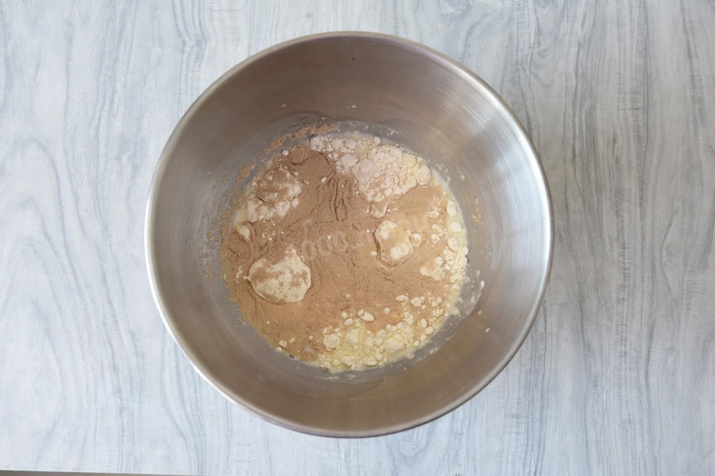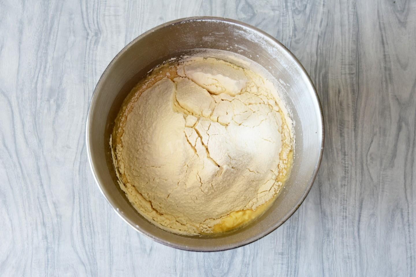 В чаше от стационарного миксера смешайте теплое молоко, нагретое до температуры 37-40℃, по 2 ст. л. муки и сахара от общего количества и сухие дрожжи. Тщательно перемешайте венчиком. Накройте чашу полотенцем и оставьте в тепле на 15-20 минут. Если у вас нет кухонной машины, можете замешивать тесто руками. Добавьте в опару яйца, желтки, мягкое сливочное масло, оставшийся сахар, ванильный сахар и соль и перемешайте венчиком до однородности.
