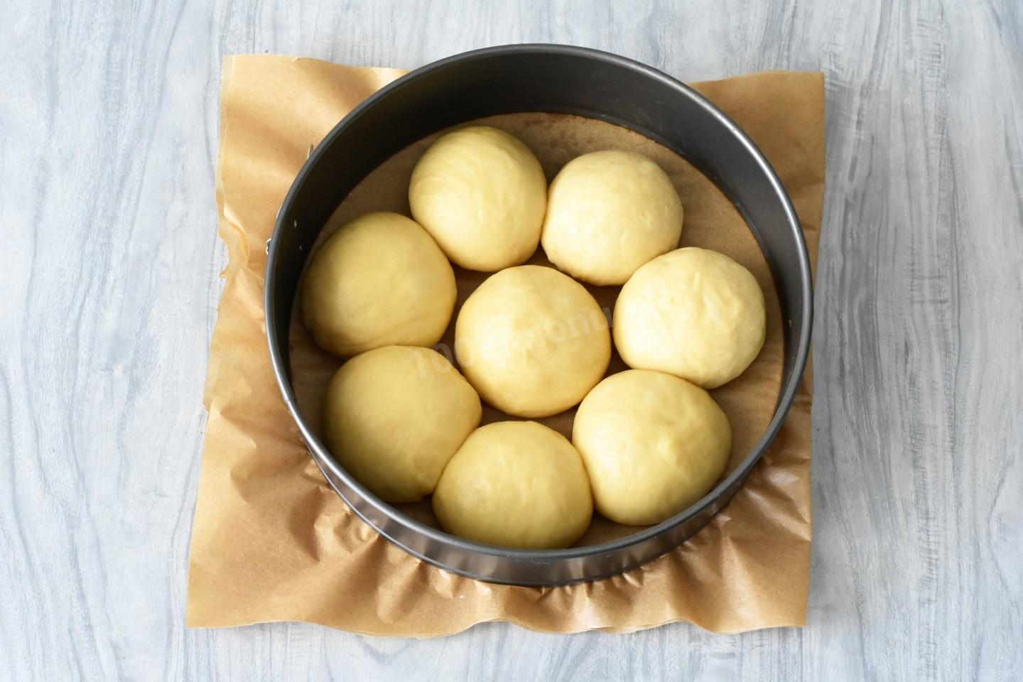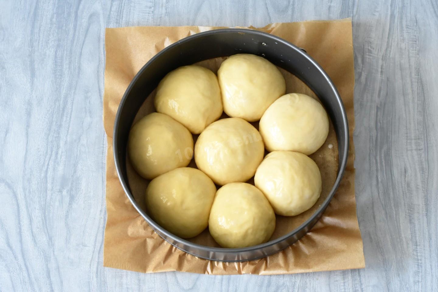 В застеленную силиконизированным пергаментом форму (Ø 22-24 см) выложите 8 заготовок, формируя цветок. Накройте форму полотенцем и оставьте для подъема на 30 минут. Точно также сформуйте вторую булочку. Подробнее о пергаменте для выпечки вы можете прочитать в статье. Ссылка в конце рецепта.