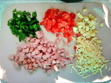 Ветчину нарежьте средними кубиками. При желании можете срезать с ветчины корочку и жировые прослойки, как это сделала я.