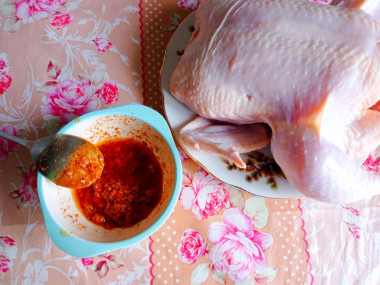 Тушку крицы промойте под проточной холодной водой, обсушите бумажными полотенцами. Удалите остатки пуха и перьев. Выложите курицу в глубокую форму и тщательно натрите тушку курицы со всех сторон подготовленным маринадом. Оставьте курицу мариноваться минимум на 2-3 часа, а лучше убрать на ночь в холодильник. Затем нафаршируйте курицу вымытыми яблоками без сердцевинки, разрезанными на четыре части. Если яблоки крупные, то разрежьте их на восемь частей.