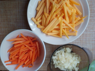 Луковицу нашинкуйте максимально мелко. Чеснок нарубите ножом или пропустите через пресс. Морковку и тыкву нарежьте крупными брусочками.