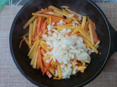 В сковороде разогрейте небольшое количество растительного масла. Отправьте морковку обжариваться. Перемешивая, готовьте около 2-3 минут. Как выбрать сковороду и масло для жарки читайте в статьях на эти темы. Ссылки есть в конце этого рецепта.