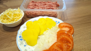 Как сделать картофель с фаршем и помидорами в духовке запеканку? Подготовьте все необходимые продукты. Фарш берите любой, у меня говяжий. Специи также выбирайте по вкусу. У меня перец черный и паприка.