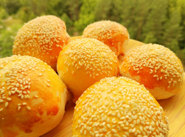 Смажьте булочки желтком со всех сторон и посыпьте кунжутом. Выпекайте булочки в предварительно разогретой до двухсот градусов духовке в течение получаса. Время и температура указаны приблизительно, ориентируйтесь на свою духовку.