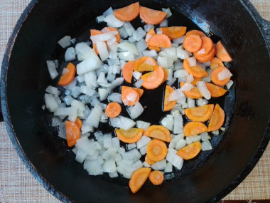 В кастрюлю с толстым дном влейте растительное масло. Выложите лук и морковь. Как выбрать растительное масло, которое не боится термической обработки вы узнаете прочитав статью на эту тему. Ссылка есть в конце этого рецепта.