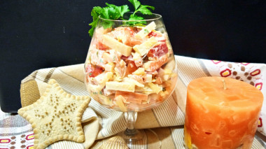 Понравился салатик, спасибо. Знаю вариант салата с крабовыми палочками, помидор и сыра.