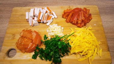 Как сделать салат с болгарским перцем крабовыми палочками, сыром и помидорами? Подготовьте все необходимые ингредиенты. Крабовые палочки при необходимости нужно предварительно разморозить, переложив их из морозилки в холодильник. Помидоры лучше выбирайте плотные, мясистые, с минимальным количеством семян. Сыр можно брать любой на свой вкус. Чем острее сыр, тем ярче будет вкус у салата. Майонез можно заменить сметаной или густым натуральным йогуртом.