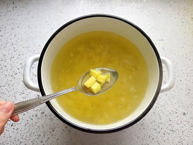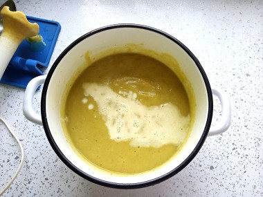 По вкусу добавьте немного соли и специй. Затем с супа отлейте немного бульона в отдельную посуду. Он пригодится для регулирования консистенции готового супа-пюре. Оставшуюся часть супа перелейте в блендер.