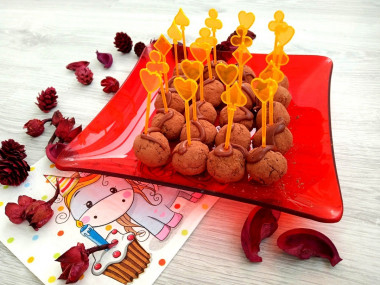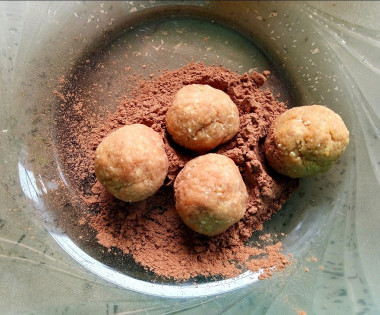 На тарелку насыпьте какао-порошок. Обваляйте каждый шарик в какао.