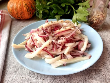 Салат-закуска из маринованных кальмаров и лука получается очень вкусным. Он действительно скрасит самый обычный ужин. Хоть в этом салате всего два ингредиента, но они прекрасно дополняют друг друга. Нежный мягкий кальмар (благодаря быстрой варке) и хрустящий ароматный лук соединяются в вкусный пикантный дуэт. Легкий маринад делает эту смесь весьма необычной, в меру островатой. Такой салат можно подать на стол как закуску для гостей или домочадцев.