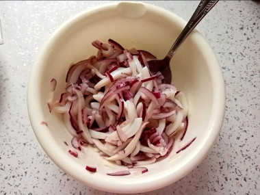 Давно хотела сделать салат с маринованными кальмарами и луком. Наконец-то, у меня появились кальмары, но как с ними обращаться я подзабыла. Хорошо, что в рецепте все подробно описывается. Тушки у меня были не очищенные, разморозила их и промыла. После опускания к кипящую воду варила минуту, при этом тушки переворачивала вилкой, т. к. они надулись. После этого кальмары легко очистились. Нарезала их соломкой, красный лук четвертькольцами. Заправляла оливковым маслом и яблочным уксусом. После часа маринования попробовала, мне не хватило соли и сахара. Добавила ориентируясь на свой вкус. Получилось просто отлично! Кальмары мягкие, сочные, остренькие! Лук тоже после маринования стал очень вкусным, кисленьким. Этот салат можно подать к пенному напитку в качестве закуски.