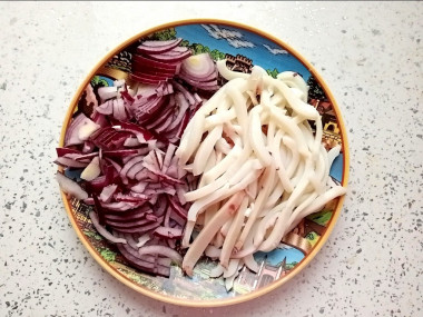 Лук очистите от шелухи и порежьте полукольцами. Добавьте нарезанный лук к кальмару.