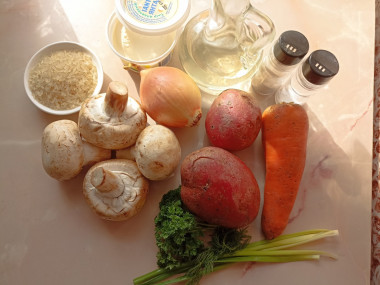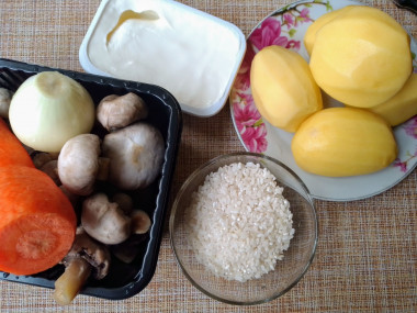 Калорийность продуктов: Шампиньоны, Картошка, Лук, Морковь, Плавленый сыр, Рис, Вода, Растительное масло, Зелень, Соль