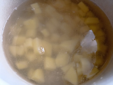 Картошку нарежьте одинаковыми небольшими кубиками или брусочками, как Вам более привычно. Отправьте картофель и чистый рис в кастрюлю. Залейте всё водой, поставьте на сильный огонь и дождитесь момента закипания, посолите по вкусу. Если образовалась пенка, уберите её с помощью шумовки. Убавив огонь до среднего, оставьте кастрюлю на плите под закрытой крышкой до готовности картошки. На это уйдёт примерно 15 - 20 минут.