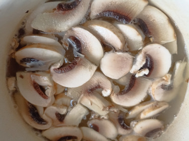 Когда будет готов картофель (проверить готовность можно, проткнув кусочек ножом, картошка должна быть абсолютно мягкой), сделайте огонь на максимум. Тут же отправьте в кастрюлю шампиньоны.