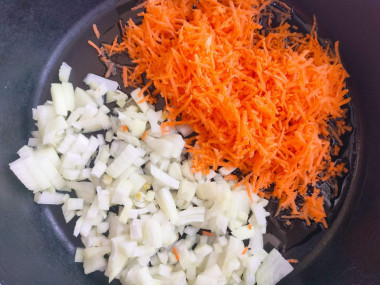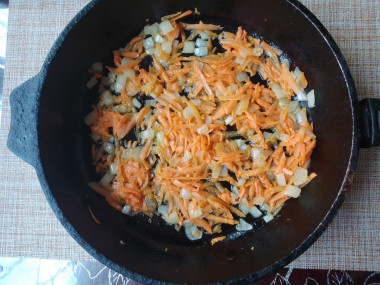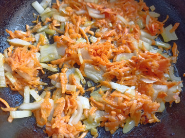 В то время, пока варится картофель и рис, приготовьте остальные ингредиенты. Морковь натрите на средней тёрке, либо нарежьте по своему вкусу, главное мелко. Лук нашинкуйте тоже некрупно. Это нужно, чтобы овощи обжарились быстро и одновременно. В сковороде разогрейте растительное масло и обжарьте в нём морковку и лук. На каком масле лучше жарить? Лучше выбрать масло с наибольшей температурой дымления (т.е. нагревается и долго не горит)