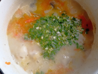 Отправьте в суп мелко нарезанную зелень. Очень хорошо подойдёт зелёный лук и укроп. Но вы можете использовать любую другую зелень по вашему вкусу. После повторного закипания плиту выключаем, суп накрываем крышкой и даем настояться не менее 10-15 минут.