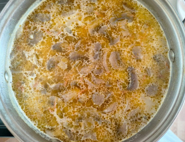 Грибной суп обычно получается серым и неаппетитным. Но по этому рецепту вышел очень красивый яркий супчик! Я думаю, такая красота получается за счет плавленного сыра, а так же обжарки моркови в масле, т.к. во время этого процесса морковь отдает каротин, он то и придает приятный желтоватый оттенок) Суп мне очень понравился, вкус у него сливочный, мягкий. За счет риса получилась приятная нежная консистенция. Лук я не стала обжаривать, сварила целую луковицу, а потом удалила ее из бульона. Плавленный сыр взяла грибной, что так же придало насыщенный грибной вкус. В общем все очень понравилось, рекомендую к приготовлению этот замечательный суп!