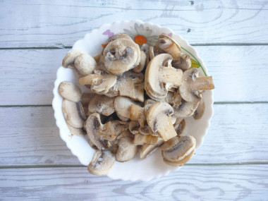 Шампиньоны (в рецепте я использовала коричневые, но можно взять белые) нарежьте пластинками 3-4 мм.