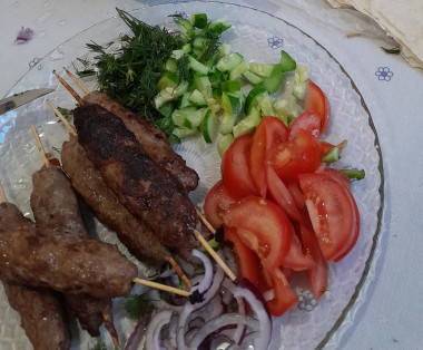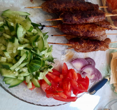 Подавайте люля-кебаб горячим с овощным салатом, хлебом, лепешками, отварным картофелем и различными соусами.