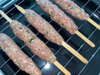 Для приготовления в духовке вам понадобятся шпажки и жаропрочная форма. Форму подберите заранее, проверив, чтобы на нее можно было выложить шпажки с фаршем как на фото шага 7. Шпажки возьмите длиной не менее 20 см. Если они очень тонкие (диаметром 2-3 мм), для одного люля-кебаба можно взять несколько штук. Так мясо будет прочнее держаться. Чтобы они не сгорели при запекании, залейте их холодной водой и оставьте примерно на час.
