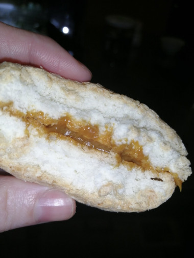 Хочу сказать, что печенье получилось снаружи хрустящее, а внутри очень нежное и мягкое. Но так как мы любим чуть более сладкое, то я решила соединить половинки печенья между собой вареным сгущенным молоком, что кажется сделало его еще намного вкуснее и придало особую изюминку.