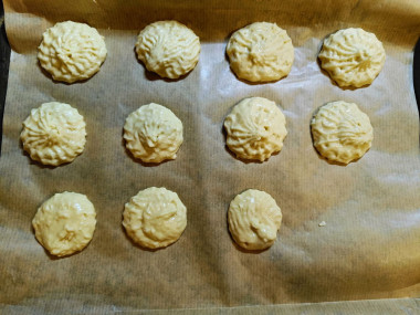 Застелите противень пергаментом. С выбором пергаментной бумаги поможет статья по ссылке в конце рецепта. Затем переложите тесто в кондитерский мешок и выдавливайте небольшие круглые печеньки или же выложите тесто ложкой прямо на бумагу для выпечки.