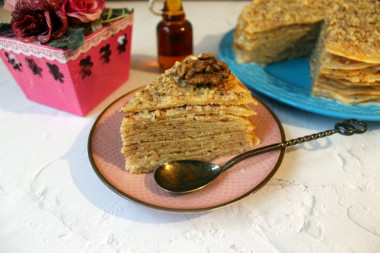 Блинчики промажьте сгущенкой, посыпьте измельченными орехами и сложите друг на друга.