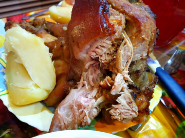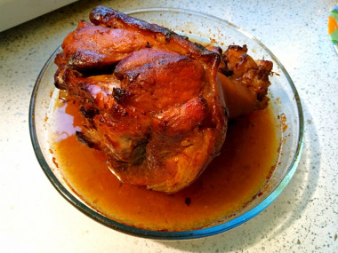 Этот рецепт я давно уже добавила в закладки, чтобы приготовить на Рождество. Очень уж хотелось чего-то не стандартного и вкусного. Рульку я оставила при разделки целой свиной ноги, специально оставила побольше мяса. В итоге она вытянула на три килограмма, соответственно увеличила и количество остальных ингредиентов. Из того, что нужно было добавить в пиво, у меня не было острого перца, да мне и не хотелось его добавлять, т. к. угощались дети. Дополнительно добавила в бульон веточки петрушки. Варила рульку немного дольше, чтобы точно проварилась, иногда подливала кипяток. В процессе варки переворачивала рульку разными боками. Запах при этом своеобразный, конечно) Но на этот случай есть вытяжка и открытая форточка) Делала все это накануне праздника. Готовую рульку оставила остывать в бульоне и окончательно остудила в холодильнике. На следующий день достала рульку из "холодца") Бульон в форму не наливала, сама рулька была покрыта слоем застывшего желе и жира. Поэтому я ее просто положила в форму и поставила в разогретую духовку. Через 10 минут достала и смазала глазурью. Всего запекала 45 минут. Каждые 15 минут смазывала горчицей и медом. Это блюдо произвело фурор! Гостей было много, четыре семьи и все попробовали это чудесное мясо. Предполагаю, что алкоголь выветрился во время варки, но при этом мясо пропиталось вкусом темного пива. Глазурь остро-сладкая, шкурка просто великолепная. Просто я очень люблю шкурку)) Мясо отлично распарилось, оно стало мягким, нежным, ароматным. Подавала с отварным картофелем. Я очень рада, что приготовила это чудесное блюдо! Катюша, огромное спасибо за рецепт! Всем рекомендую попробовать вепрево колено по чешски по этому рецепту, она шикарная!