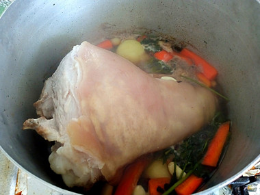 Спустя час откройте крышку и переверните рульку на другую сторону, чтобы она проварилась равномерно. Опять накройте кастрюлю крышкой. Оставьте вариться еще на один час.