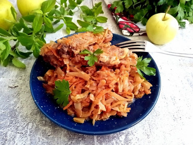 Ребрышки я для начала помыла, обсушила и натерла солью и паприкой. А потом обжарила до румяной корочки. Запах жареного мяса очень аппетитный, уже хочется все съесть). Овощи не стала выкладывать прямо к косточкам, иначе не удобно перемешивать. Поэтому ребрышки вынула на тарелку, а в сковородке обжарила лук, морковь и капусту слегка. Потом все соединила, добавила томатную пасту и немного воды. Теперь уже тушила все вместе примерно пол часа, т. к. капуста у меня жесткая. Молодую нужно тушить меньше по времени и нарезать покрупнее. Капуста в процессе приготовления пропиталась мясным соком и стала такой вкусной и нежной! Ребрышки же получили сочность от овощей. Это блюдо сытное, хорошо подходит на ужин. Особенно с домашними соленьями.