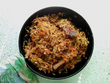 Чем дольше капуста будет тушиться, тем лучше все ингредиенты пропитаются соком и ароматом друг друга. Готовность капусты, все же, определяйте на свой вкус. Кто-то любит, чтобы она немного хрустела, а кому-то нравится совсем мягкая. Готовую тушеную капусту с ребрышками снимите с огня и оставьте под крышкой, чтобы блюдо настоялось. Затем подавайте в горячем виде. Приятного аппетита!