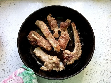 На горячую сковороду налейте немного растительного масла для жарки и выложите нарезанные ребрышки. Обжарьте их со всех сторон до золотистого цвета на среднем огне.