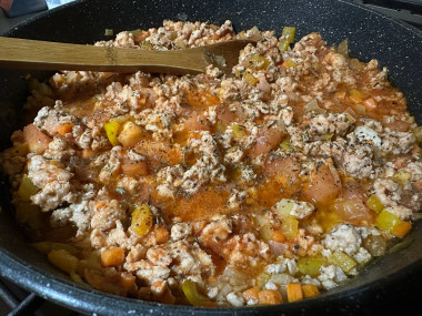 Положите к овощам фарш, хорошо разбейте его лопаткой. Жарьте все вместе около 5 минут.
