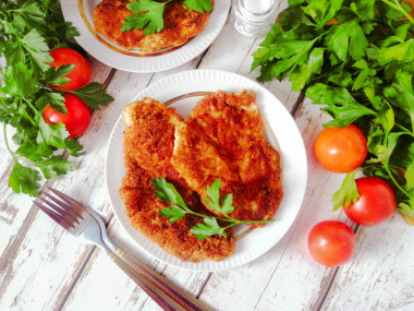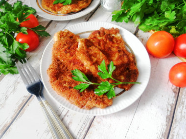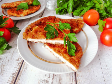 С удовольствием воспользовалась рецептом шницеля куриного в панировке на сковороде. Шницели получились сочные, мясо нежное, а панировка хрустящая. Подавала без гарнира, с пылу с жару, со свежими овощами и листьями салата. Очень вкусно!!! Спасибо за рецепт, Юлия М!