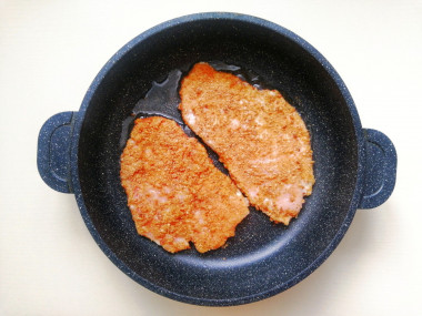 На сковороду налейте немного растительного масла и разогрейте её до горячего состояния. В горячее масло выложите куриный шницель. Обжарьте его на сильном огне с двух сторон по 1-2 минуты с каждой. Он станет золотистого цвета.