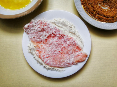Можно приготовить шницель в двойной панировке. Для этого повторите все шаги обваливания - мука, яйцо, сухари - еще раз.