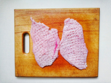 Разделывала курицу и оставила грудку, чтобы приготовить шницель. Половину грудки разрезала на две части, затем отбила кулинарным молотком. Заготовки для шницелей у меня получились довольно тонкие.
