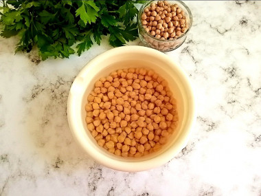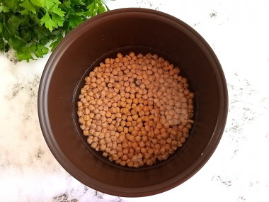 пересыпьте нут в глубокую миску и залейте его полностью водой (обычной холодной). Воды должно быть раза в четыре больше, чем самого нута. Оставьте нут в воде для набухания на 10 - 12 часов. За это время желательно несколько раз сменить воду, в которой будет находиться нут. Я оставляла горох на столе при комнатной температуре.