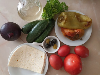 Нужен был лёгкий овощной салат, я выбрала рецепт шопского салата классического болгарского. Болгарский перец запекла заранее, пока в духовке готовилось печенье. Осталось только нарезать все ингредиенты на плоское блюдо, полить растительным маслом, натереть сверху брынзу, украсить оливками и маслинами и салат готов! Сочный, аппетитный и очень вкусный! Ингредиенты в нем прекрасно сочетаются и дополняют друг друга . Спасибо автору за рецепт!
