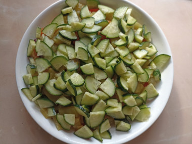 Лук почистите, нарежьте тонкими четверть кольцами и равномерно выложите следующим слоем на помидоры.