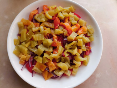 Остывший запеченный перец почистите от кожицы и семян. Нежную мякоть нарежьте ломтиками среднего размера и выложите на лук.