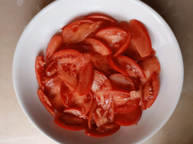 Помидоры промойте, удалите плодоножку и нарежьте мякоть ломтиками среднего размера. Выложите в один слой на плоскую тарелку.