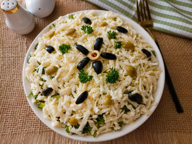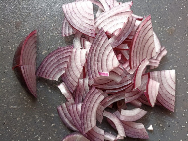 Обычный репчатый лук перед добавлением в салат лучше обдать кипятком, чтобы удалить резкий вкус. Также его можно замариновать.
