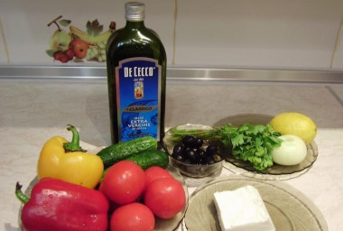 Калорийность продуктов: Огурцы, Помидоры, Болгарский перец, Брынза, Растительное масло, Лук, Петрушка, Маслины