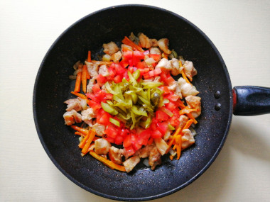В это время нарежьте помытые помидоры на кусочки. Маринованные огурцы натрите на крупной терке или просто нарежьте ножом. Мне больше нравится вариант с тертыми огурцами. Добавьте помидоры и огурцы в кастрюлю и продолжайте тушение еще 10 минут.