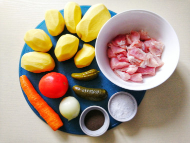 Вместо говядины использовала свинину. Поочерёдно обжарила на сковороде мясо, лук, морковь, затем добавила помидор и маринованные огурцы. На отдельной сковороде обжарила картошку. Готовила ее сначала не закрывая крышкой. Потом, когда картошка немного "схватилась", - под крышкой. Довела её до полуготовности, затем выложила в сковородку с мясом и овощами. Добавила туда же немного воды, тушила до готовности.