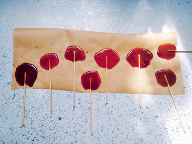 Увидела рецепт и вспомнила, что тоже когда-то делала такие леденцы, только в силиконовых формочках. А еще я тогда добавляла лимонную кислоту вместо сока. На этот раз приготовила все по этому рецепту. Готовность карамели проверяла так же, окунув палочку с холодную воду. Готовится сироп очень быстро, а готовые конфетки застывают еще быстрее. В сироп добавила каплю красного красителя. Не очень полезно, зато цвет стал яркий. Сироп наливала чайной ложкой на пергамент. Леденцы получились вкусные, как в детстве, когда нагревали на газу сахар в ложке)) Я забыла дождаться, когда сойдут пузыри, поэтому карамель получилась с дырочками внутри. Дочке понравилось)