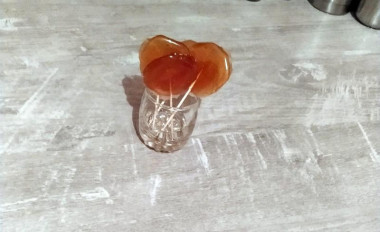 Дайте карамели немного повариться, она будет бурно кипеть и чуть пожелтеет. Это будет сигналом сделать пробу. Для этого окуните деревянную палочку на секунду в кипящий сироп, выньте и сразу опустите в холодную воду. Опустив палочку в воду, быстро поболтайте ее в воде, чтобы остудить карамель.