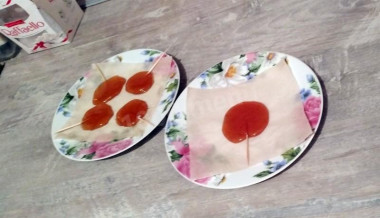 Таким образом сделайте карамельки на палочках в домашних условиях из сахара из всего сиропа. Дождитесь их полного остывания и только потом уберите их с бумаги. Приятного угощения!